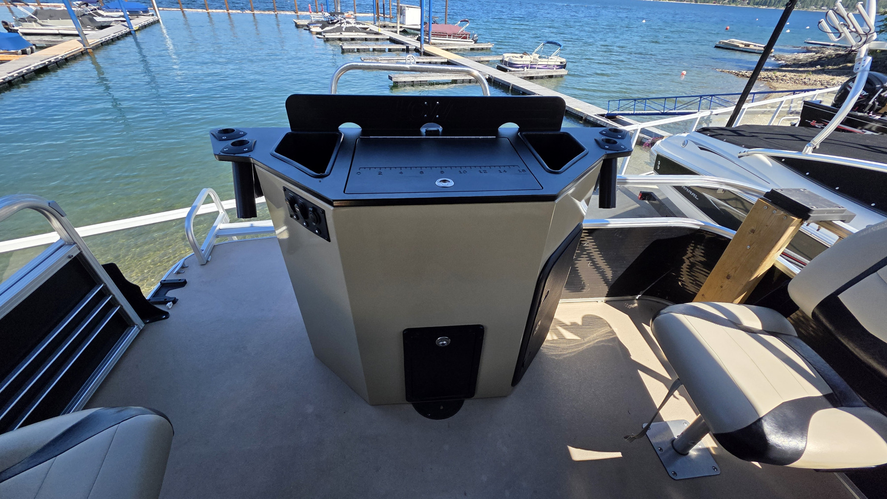 Great deals on pontoon boats don’t come along often, but we have one here! This is a 23’ triple pontoon with a 200HP Mercury outboard. Don’t let the 820 hours on the motor deter you – there’s lots of life left in this unit and many summers of fun for you and your family! 13 person seating capacity means you don’t have to leave anyone at the dock! Vinyl is all in great condition. Comes with a double bimini top, cockpit cover, vinyl floor for easy cleaning, live well, downrigger mount (no downrigger included), fish table and rod holders. Also has a custom welded kicker bracket. Comes on a tandem axle trailer with brakes.