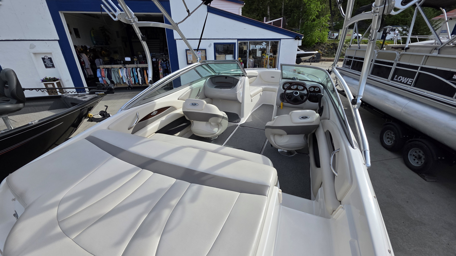 This is a very well cared for example of a 1 owner low usage family boat! 190 hours on the hour meter, fresh water only and always professionally maintained. This boat has an extended swim platform, wakeboard tower, bimini top, bow and cockpit covers, 4 speaker CD stereo, all the filler cushions, all upholstery in great condition, snap out carpets and more! The Mercruiser 5.0 MPI is a great power plant and with the bravo 3 sterndrive it gives great control and efficient cruising.