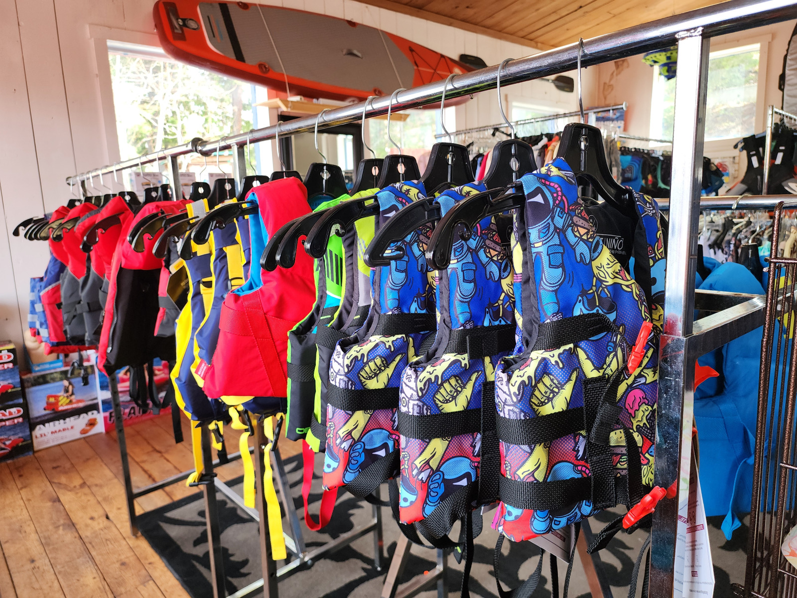 At our Marina you will find everything you need for you or your boat. On the first floor you will find boards, swimwear, clothes, sandals, sunglasses, sunscreen, towels and life jackets. On our second floor you will find a complete selection of boat & toy accessories, inflatable water toys and stand up paddle boards. If we don’t have what you are looking for, we will happily order it, most of the time we will be able to have your special order the next day. For special orders give us a call at 250.675.2250.